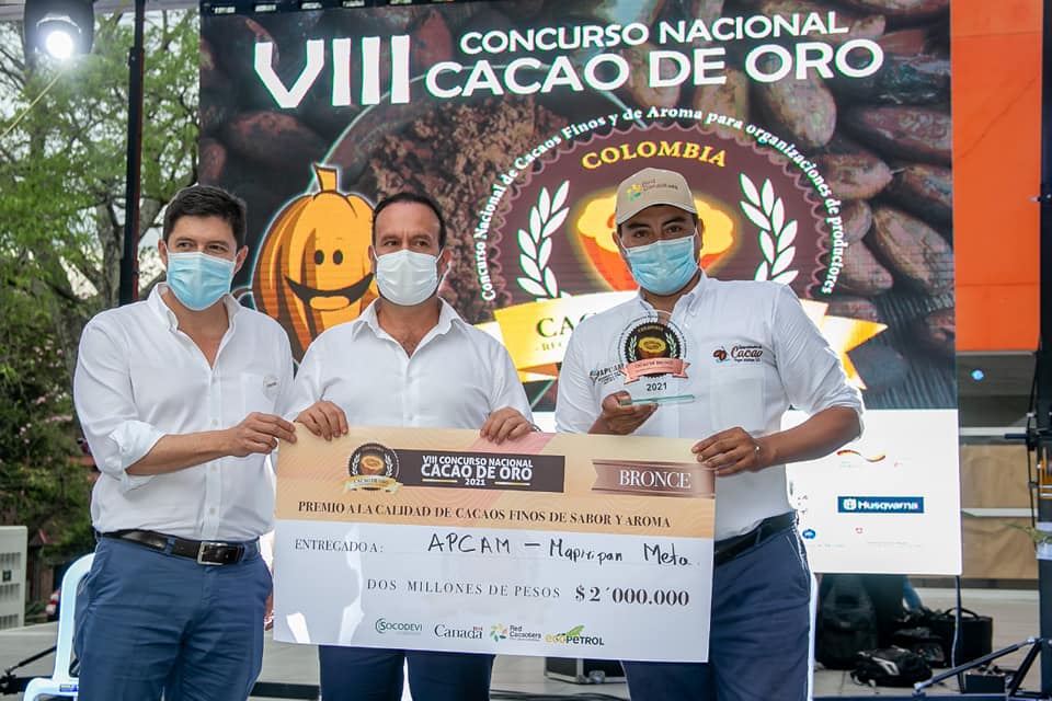 Y el tercer lugar que recibió el galardón del CACAO DE BRONCE fue para la Asociación de Productores y Comercializadores de Cacao APCAM de Mapiripán Meta, quienes recibieron: